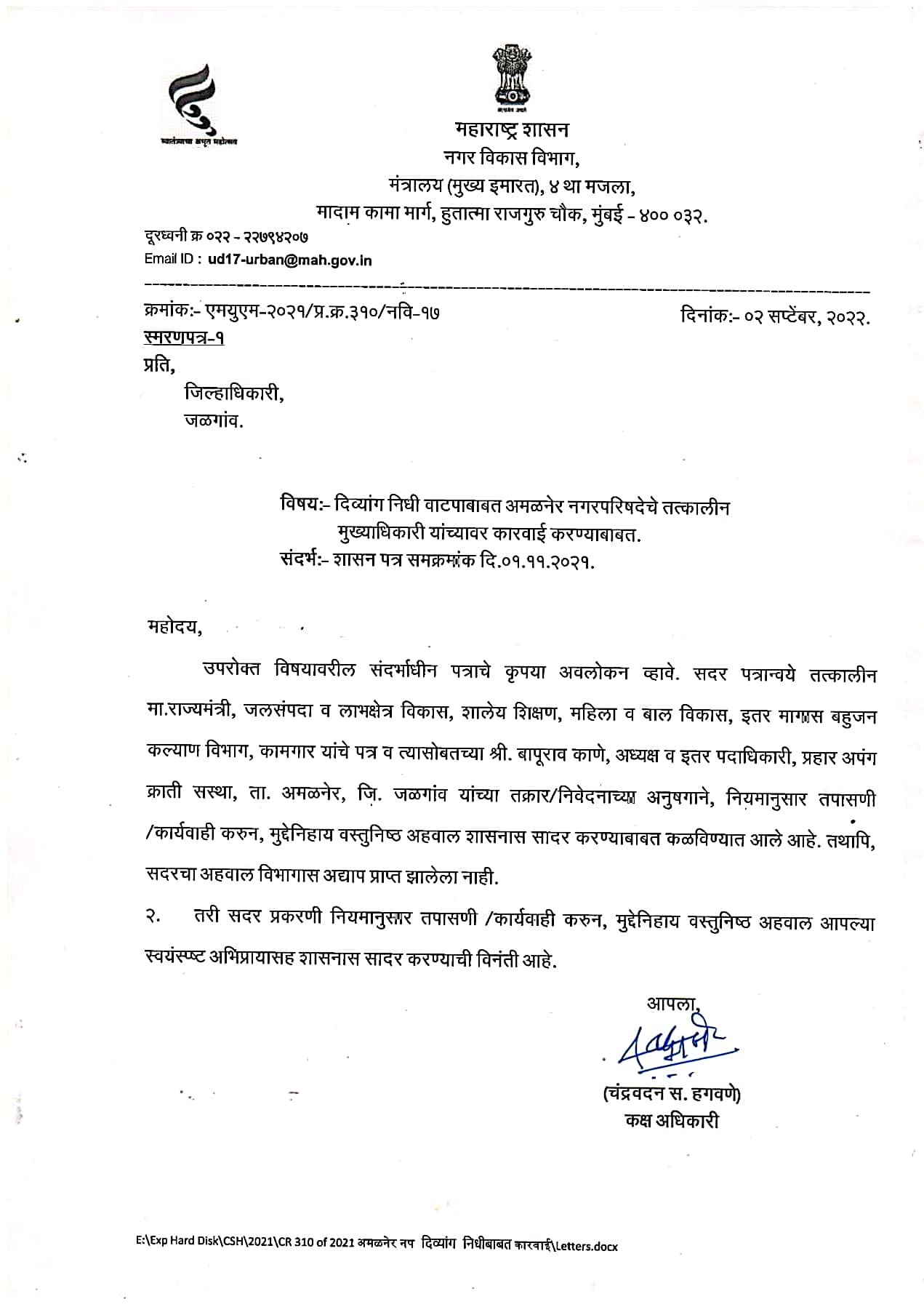 प्रतिनिधी: अमळनेर नगरपरिषद दिव्यांग निधी वाटपात हरलगर्जी पणा करून तत्कालीन मुख्याधिकारी यांनी घोळ केल्याप्रकरणी प्रहार दिव्यांग क्रांती संघटनेचे तालुकाध्यक्ष योगेश पवार यांनी जिल्हाधिकारी जळगांव यांच्याकडे तत्कालीन मुख्याधिकारी यांच्यावर कारवाई ची मागणी केली असता जिल्हाधिकारी जळगांव यांनी कोणतीही कारवाई न करता योगेश पवार यांना वरिष्ठ प्राधिकरण यांच्याकडे न्याय मागण्याचे पत्र दिले होते. दिव्यांग बांधवांना न्याय मिळवून देण्यासाठी योगेश पवार यांनी थेट राज्यमंत्री बच्चूभाऊ कडू यांचाकडेस मंत्रालयात जाऊन तक्रार दिल्याने सदरील तक्रारींवर नगरविकास विभाग प्रधान सचिव यांनी दि.२९ नोव्हेंबर २०२१ रोजी जिल्हाधिकारी जळगांव यांच्याकडून सदर प्रकरणी नियमानुसार तपासणी /कार्यवाही करून, मुद्देनिहाय वस्तुनिष्ठ अहवाल आपल्या स्वयंस्पष्ट अभिप्रायसह शासनास सादर करण्याचे आदेश देण्यात आले होते.