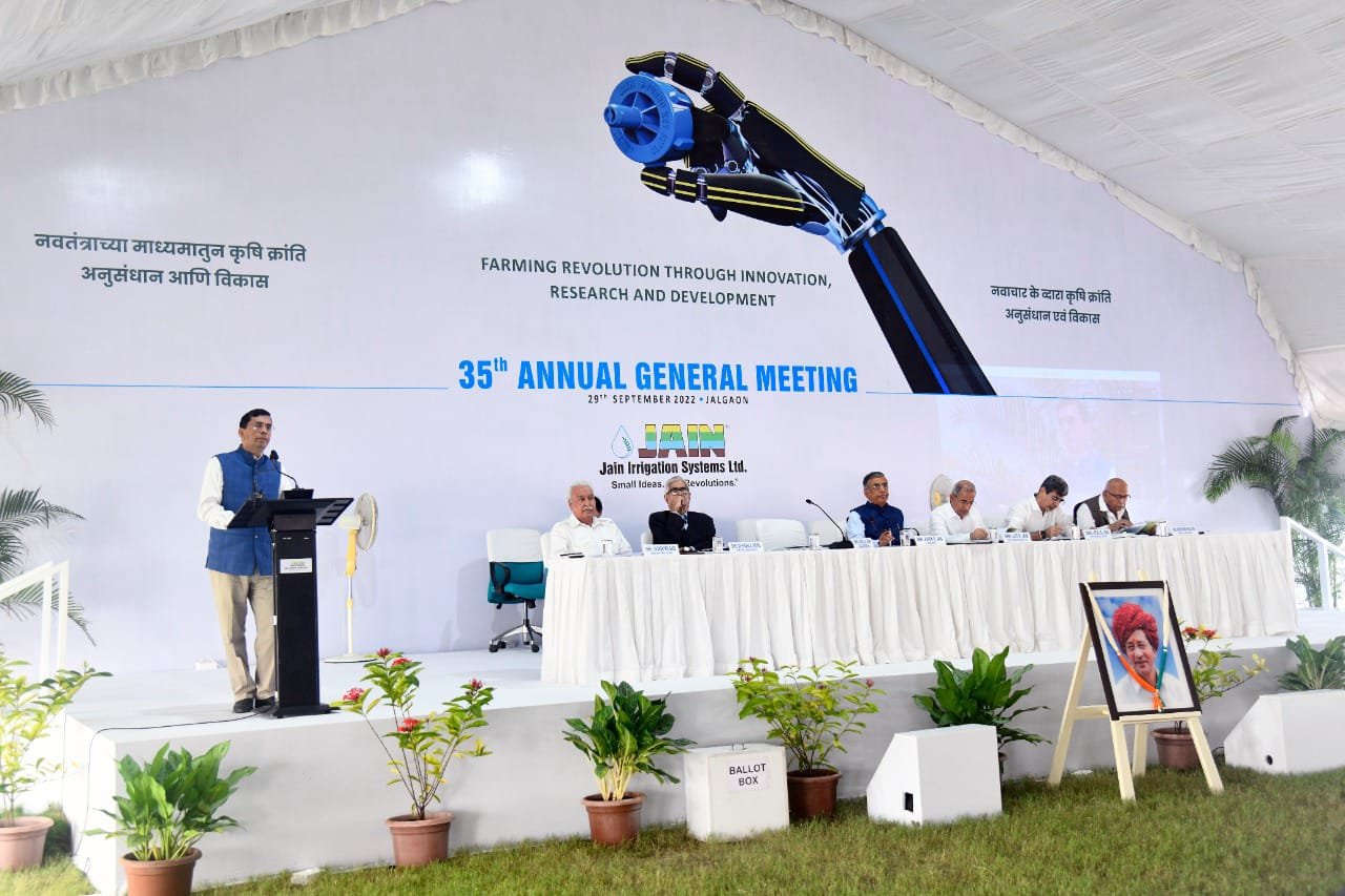 जैन इरिगेशन सिस्टिम्स लि. च्या ३५ व्या वार्षिक सर्वसाधारण सभेत अनिल जैन बोलत होते. बांभोरी येथील प्लास्टिक पार्कच्या प्रशासकीय इमारतीसमोरील पटांगणावर झालेल्या सभेच्या व्यासपीठावर अध्यक्ष अशोक जैन, सहव्यवस्थापकिय संचालक अजित जैन, सहव्यवस्थापकिय संचालक व चिफ फायनन्शिअल ऑफिसर अतुल जैन, संचालक डी. आर. मेहता, डॉ. एच. पी. सिंग, घनश्याम दास तसेच जैन परिवारातील ज्येष्ठ सदस्य दलिचंद जैन आणि जैन फार्मफ्रेश फूड्सचे संचालक अथांग जैन उपस्थित होते. तसेच ऑनलाईन व्हिडिओ कॉन्फरन्सच्या माध्यमातून कंपनीचे अन्य संचालक व सेक्रेटरी ए. व्ही. घोडगावकर व ऑडिटर्स उपस्थित होते.