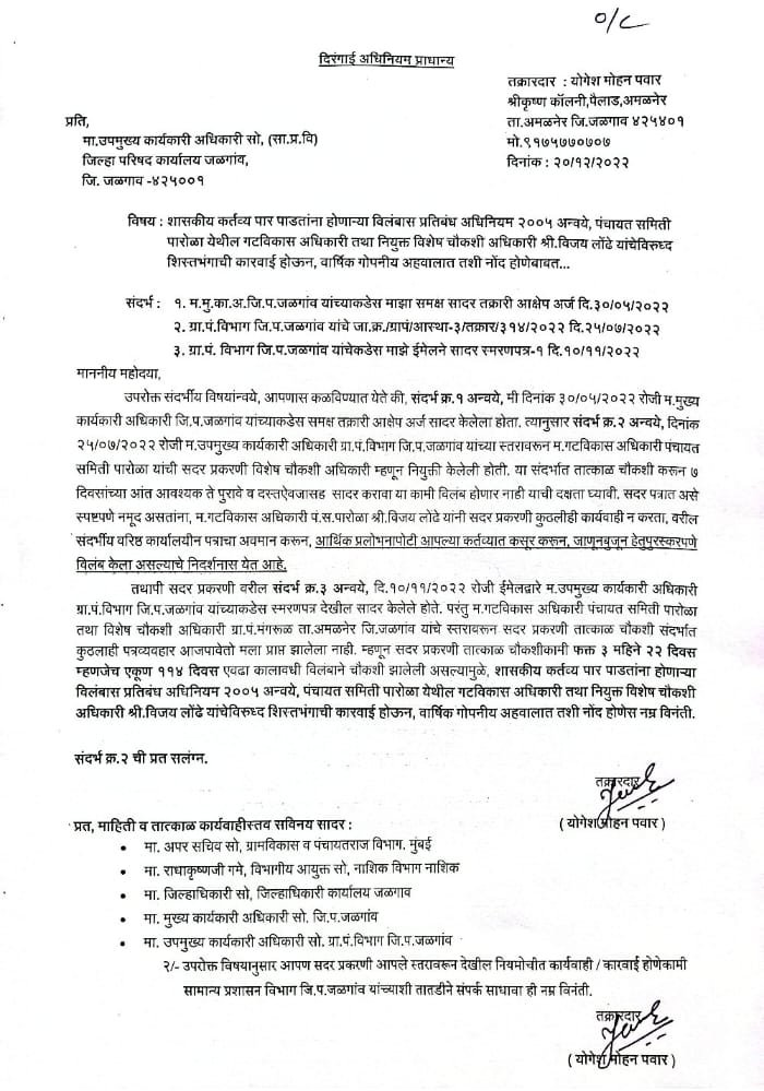मंगरूळ ग्रा.पं. ता.अमळनेर येथील विशेष चौकशी अधिकारी म्हणून नेमणूक करण्यात आली होती. सदर चौकशी प्रकरणी तक्रारदार योगेश पवार यांनी वेळोवेळी पाठपुरावा करूनही कोणताही प्रतिसाद न देता श्री.विजय लोंढे यांनी जाणूनबुजून हेतुपुरस्कर आर्थिक प्रलोभनापोटी आपल्या कर्तव्यात कसूर करून चौकशी न करता वरिष्ठांच्या तात्काळ आदेशाला केराची टोपली दाखवुन विलंब केला जात असल्याने मा. अपर मुख्य सचिव ग्रामपंचायत पंचायतराज मुंबई, विभागीय आयुक्त कार्यालय नाशिक, मुख्य कार्यकारी अधिकारी जिल्हा परिषद जळगांव यांच्याकडेस अर्ज करून ७ दिवसाचे आदेश असतांना ११४ दिवस होऊनही चौकशी अहवाल सादर केला नाही अश्या पाठराखण करणाऱ्या अधिकाऱ्यावर शासकीय कर्तव्य पार पाडतांना होणाऱ्या विलंबास प्रतिबंध अधिनियम २००५ अन्वये शिस्तभंगाची कारवाई करावी व वार्षिक गोपनीय अहवालात तशी नोंद घेणेबाबत योगेश पवार यांनी तक्रार केली आहे.