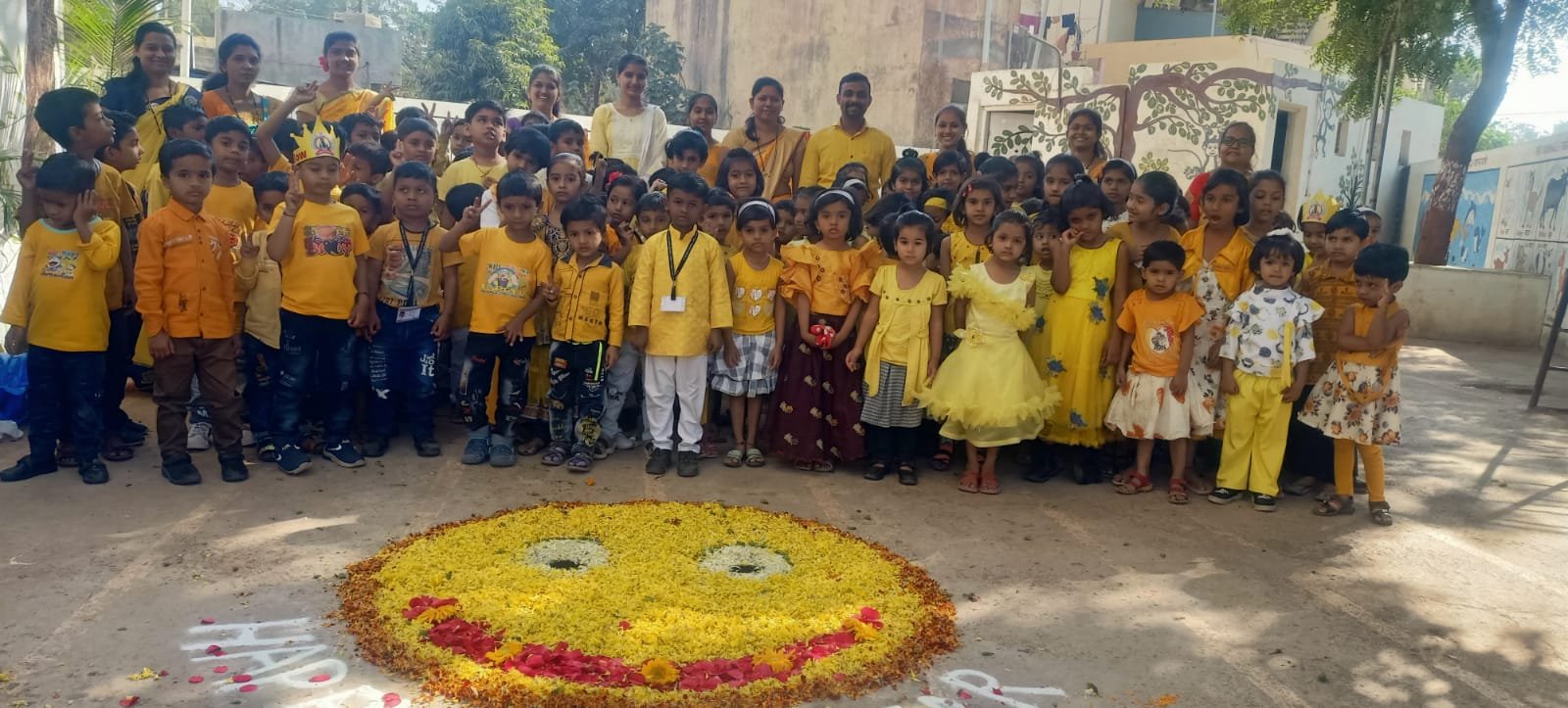 कार्यक्रमांमध्ये शाळेच्या आवारात सूर्याच्या चेहऱ्याची व पिवळ्या फुलांच्या पाकळीचा वापर करून भव्य रांगोळी काढण्यात आली होती. यावेळी विद्यार्थ्यांनी पिवळ्या रंगाचा खाऊ डब्यात आणला होता. यामध्ये ढोकळे, केळी, कुरकुरे, पोंगे, खिचडी आदींचा समावेश होता. विद्यालयाच्या आवारामध्ये सूर्यफुलाच्या आकाराचा सेल्फी पॉइंटही बनवला होता. त्या ठिकाणी विद्यार्थ्यांनी सेल्फी घेतली.