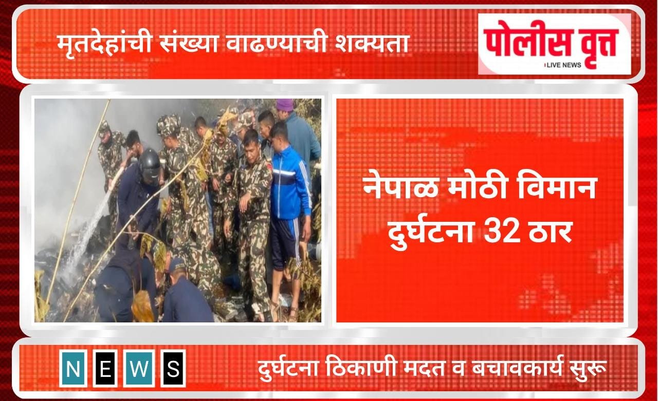 (पोलीस वृत्त-ऑनलाइन) नेपाळमध्ये आज मोठी विमान दुर्घटना झाली आहे. ७२ प्रवाशांचा समावेश असलेले विमान धावपट्टीवर कोसळून मोठा अपघात झाला आहे. पोखरा येथील यति एअरलाइन्सच्या विमान अपघातातील (In a plane crash) ३२ मृतदेह बाहेर काढण्यात आले आहेत.