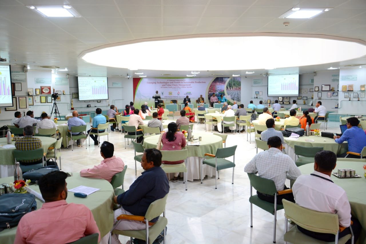 रविवारच्या पहिल्या तांत्रिक सत्राच्या अध्यक्षस्थानी पंजाबराव देशमुख कृषी विद्यापीठाचे कुलगुरू डॉ. एस. आर. गडाख होते. राजगुरूनगर येथील कांदा व लसूण संशोधन केंद्रातील शास्त्रज्ञ डॉ. ए. थंगासामी यांनी कांदा व लसूण पिकातील अन्नद्रव्य व्यवस्थापनावर पेपर सादर केला. ते म्हणाले, खरीप, उशिराचा खरीप व रब्बीमधील कांदा पिकास अन्नद्रव्यांची वेगवेगळ्या प्रमाणात मात्रा हवी असते. त्यासंबंधी कांदा व लसूण संशोधन केंद्राने शिफारसी केल्या आहेत. कांदा बियाणे रोपण, पुर्नलागवड आणि वाढीच्या काळात हे अन्नद्रव्य व्यवस्थापन व्हायला हवे. पाण्यात विरखळणारी अन्नद्रव्ये व इतर माध्यमातून उपलब्ध होणारी अन्नद्रव्ये आहेत. त्यात जमिनीची स्थिती महत्त्वाची असते, असे ते म्हणाले. जैन इरिगेशन सिस्टीम्सचे कृषीतज्ज्ञ डॉ. पी. सोमण यांनी कांदा पाणी व्यवस्थापनाची माहिती दिली. ते म्हणाले, सूक्ष्मसिंचनाच्या मदतीने पीक उत्पादन वाढले आहे. पाण्याची काटकसर करणेही त्यात शक्य झाले आहे. तुषार व ठिबक सिंचन कांदा पिकासाठी लाभदायी आहे. आंध्र प्रदेशातील कुर्नूल भागातील शेतकऱ्यांची केस स्टडीही त्यांनी सादर केली. सूक्ष्मसिंचन प्रणालीची वितरण क्षमता (डीस्चार्ज) किती आहे, हेदेखील महत्त्वाचे आहे. कारण यातून किती पाणी दिले जाते, हे लक्षात येते. त्याच्या नोंदी असायला हव्यात. कांद्याच्या १०० दिवसांच्या काळात ५०० मिलीमीटर पाणी देणे आवश्यक आहे. अतिपाण्याचा वापर टाळण्यासाठीदेखील यंत्रणा उपलब्ध आहे, असेही ते म्हणाले.