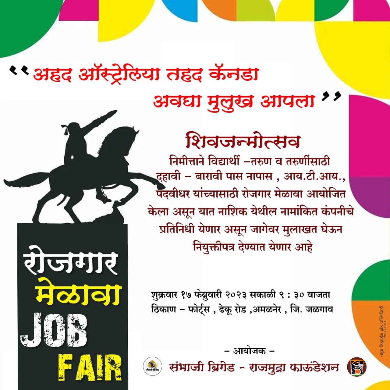 अमळनेर(प्रतिनिधी) शिवजन्मोत्सव २०२३ निमित्ताने अमळनेर येथील संभाजी ब्रिगेड व राजमुद्रा फाउंडेशनच्या संयुक्त विद्यमाने रोजगार मेळाव्याचे आयोजन करण्यात आले आहे…!
