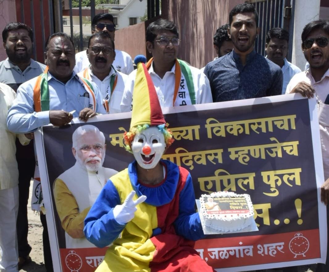 महागाई कमी करावी अशा विविध घोषणा देण्यात आला व जोकर बोलाऊन त्याच्या हस्थे केक कापण्यात आला या वेळेस