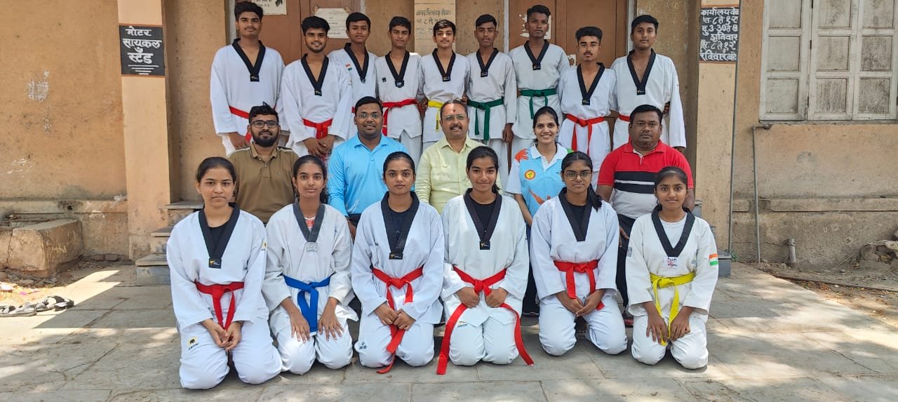 *फोटोत :- डावीकडून विशाल बेलदार, जयेश बाविस्कर, अजित घारगे, अंकिता पाटील, सुनील मोरे व तायक्वांडो खेळाडू )