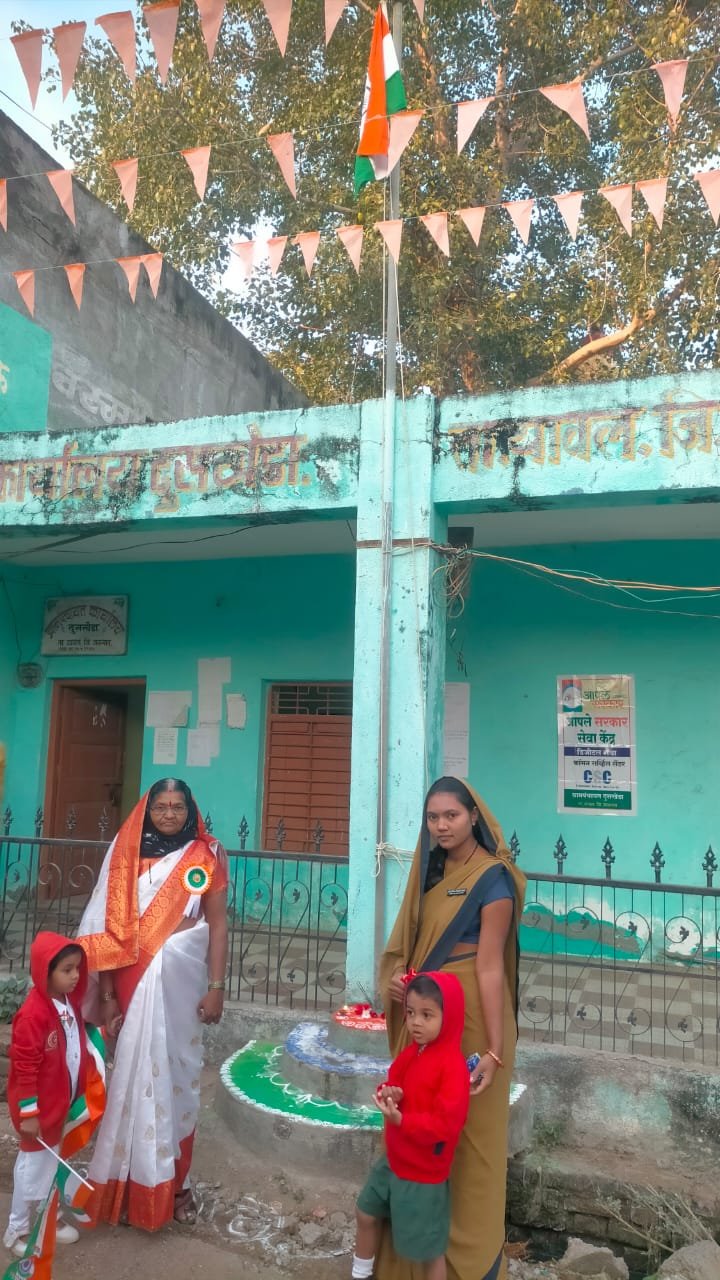 यावल (प्रतिनिधी: पोलीस वृत्त ऑनलाईन) दुसखेडा ता.यावल येथील ग्रामपंचायत सरपंच सौ लक्ष्मीबाई सोनवणे यांनी २६ जानेवारी प्रजाकसत्ताक दिनी ग्रामपंचायत कार्यालय येथे प्रथम महिला पोलीस पाटील सौ. संगिता विशाल दांडगे यांना ध्वजारोहण करण्याचा बहुमान दिला.प्रथमच गावाला महिला पोलीस पाटील हे पद मिळाल्या मुळे हा बहुमान पोलीस पाटील संगिता दांडगे यांना सरपंच यांनी दिला.यावेळी ग्रामपंचायत सदस्या चंद्रभागा दांडगे, जिल्हा परिषद शाळेचे मुख्याध्यापक विनोद तायडे, उपशिक्षक प्रशांत पाटील,नितीन चौधरी, डी आर सोनवणे, कैलास चौधरी, ह.भ.प.राजेंद्र महाराज दांडगे अंगणवाडी सेविका मुक्ताबाई सोनवणे, छायाबाई सोनवणे, अंगणवाडी मदतनीस सिंधुबाई पाटील, मंगलाबाई पवार,आरोग्य सेवक सतीश पवार, आरोग्य सेविका मनीषा जाधव, आरोग्य मदतनीस लता सोनवणे, आशावर्कर रेखा सोनवणे, सुनीता सपकाळे पशु सखी सुनिता सपकाळे, तेजस्विनी सोनवणे ग्रामपंचायतचे ऑपरेटर कैलास तायडे ग्रामपंचायत कर्मचारी संदीप सोनवणे, शंकर पाटील वायरमन चेतन पाटील सामाजिक कार्यकर्ते योगेश सोनवणे, दिनू महाराज वसु टेलर शांताराम चौधरी, यशवंत सोनवणे, सुनील बोंडे, दिव्यांग सेनेचे जिल्हा प्रसिद्धी प्रमुख विशाल दांडगे शिवाजी महाराज व मराठी शाळेतील विद्यार्थी व गावातील ग्रामस्थ मोठ्या संख्येने उपस्थित होते