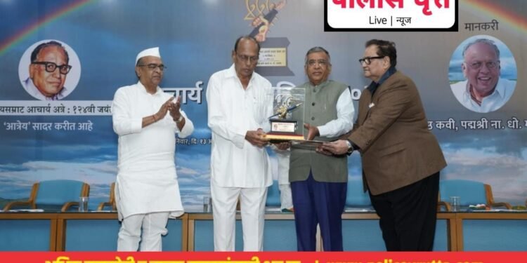 जळगाव, दि. 13 (विशेष प्रतिनिधी) : – आचार्य अत्रे हे साहित्य, नाट्य, चित्रपट, उद्योग, वक्तृत्व असा सर्वच क्षेत्रांतील सार्वभौम उत्तुंग व्यक्तिमत्त्व होते. त्यांच्या नावाने मिळालेले मानचिन्ह मी कृतज्ञतेने स्विकारतो असे प्रतिपादन कविवर्य ना. धों. महानोर यांनी सत्काराला उत्तर देताना केले.