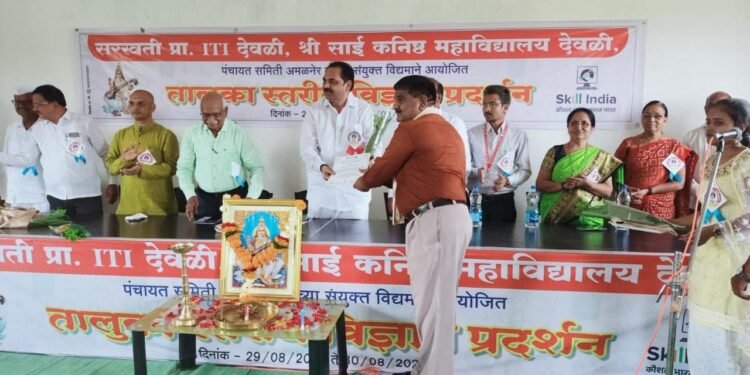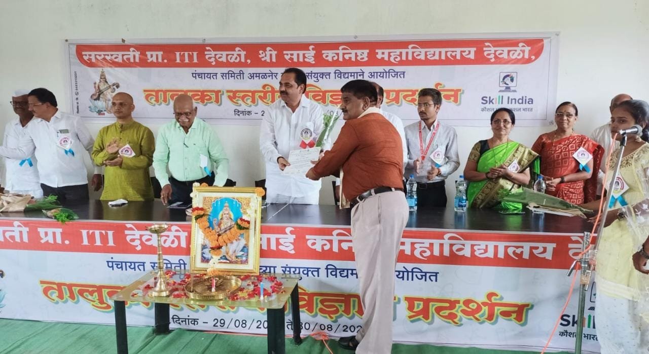 अमळनेर:- शालेय विद्यार्थ्यांना घरबसल्या अभ्यास करता यावा यासाठी व्हावेल्स फोर पीपल्स असोसिएशन अर्थात VOPA या संस्थेने व्हि स्कूल ॲप तयार केले आहे. त्याअंतर्गत महाराष्ट्रात कानाकोपऱ्यात राहणारा प्रत्येक विद्यार्थी घर बसल्या आपल्या इयत्तेचा अभ्यास करू शकतो. व स्वतःच्या ज्ञानाचा खजिना अद्यावत करू शकतो. त्यासाठी साने गुरुजी विद्यालयाची गणित शिक्षक डी ए. धनगर यांनी स्वतःचा पाठ तयार करून त्या ॲपवर अपलोड केला आहे. त्यासाठी त्यांचा जळगाव या ठिकाणी जिल्हाधिकारी अभिजीत राऊत, तत्कालीन पालकमंत्री गुलाबराव पाटील, जळगाव जिल्हा परिषदेचे पंकज आशिया, शिक्षणाधिकारी नितीन बच्छाव, प्राथमिक शिक्षणाधिकारी विकास पाटील यांच्या उपस्थितीत जळगाव येथे सन्मान झाला होता. श्री डी ए धनगर यांना तालुकास्तरावर आमदार अनिल दादा पाटील यांच्या हस्ते प्रमाणपत्र वितरित करण्यात आले. यावेळी कवयित्री बहिणाबाई चौधरी उत्तर महाराष्ट्र विद्यापीठाचे माजी कुलगुरू शिवाजीराव पाटील, गटशिक्षणाधिकारी एस पी चव्हाण, गटविकास अधिकारी शिंदे साहेब, अमळनेर शिक्षण प्रसारक मंडळाचे सचिव संदीप घोरपडे, शिक्षण विस्तार अधिकारी बर्डे मॅडम व पी डी धनगर साहेब, पी एच पाटील, संजय पाटील, उमेश काटे,आर आर सोनवणे, डी के पाटील,दिपक महाजन तसेच तालुक्यातील सर्व विज्ञान शिक्षक हजर होते.
